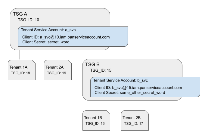 When you use multiple tenants, you will organize them in a hierarchy of TSGs and tenants. You can, if you want, create a dedicated service account for every TSG and tenant in your hierarchy. This is the simplest case, but it isn't necessary. The service account for a TSG can specify the TSG ID of any descendent of that TSG when it creates an access token.